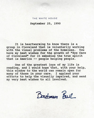 Eye Care for Cleveland supporters Barbara Bush, Mayor Michael White, Bishop Antony Pilla, Cleveland Eye Clinic, Cole Vision, County Prosecutor Stephanie Tubbs Jones, Tim Hagan Cuyahoga County Commissioner
